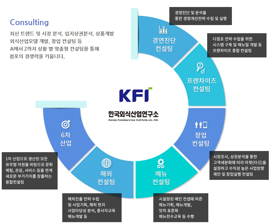 최신 트렌드 및 시장 분석, 입지상권분석, 상품개발, 외식산업모델 개발, 창업 컨설팅 등 A에서 Z까지 상황 별 맞춤형 컨설팅을 통해 점포의 경쟁력을 키웁니다.